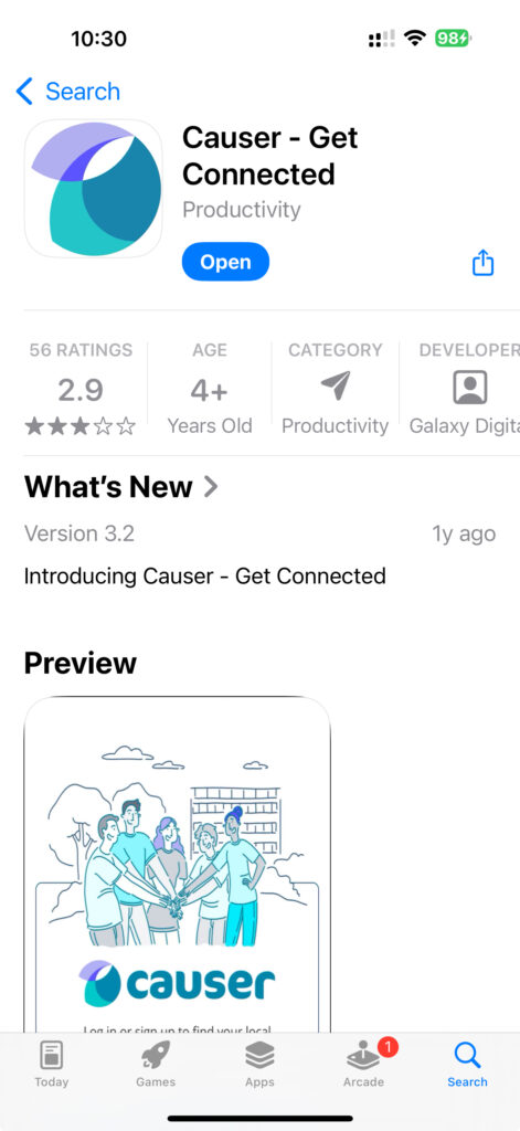 - Using your mobile device’s App Store or Google Play Store, search for and download Causer – Get Connected.